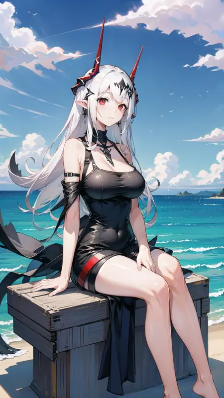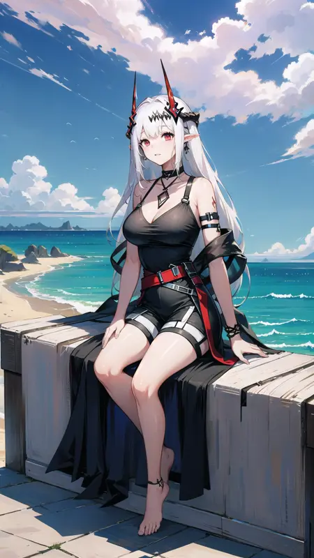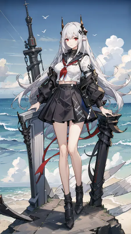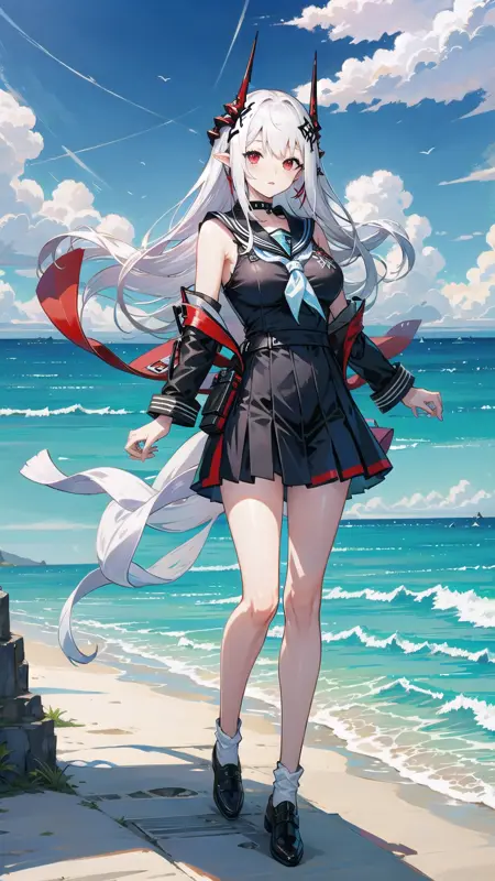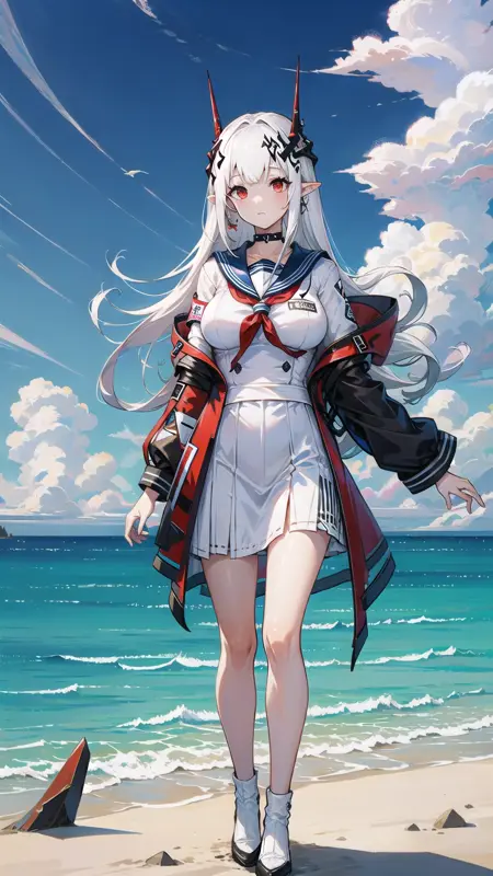 1girl, woman, mudrock (arknights), red eyes, solo, long hair, horns, (sailor uniform, serafuku), school uniform, hair ornament, pointy ears, breasts, white hair, oripathy lesion (arknights), infection monitor (arknights), bangs, breast, full body, standing, lora:MudrockV1-000006:0.6, mudrockdefclass, black horns, horns, beach background, blue sky, clouds,