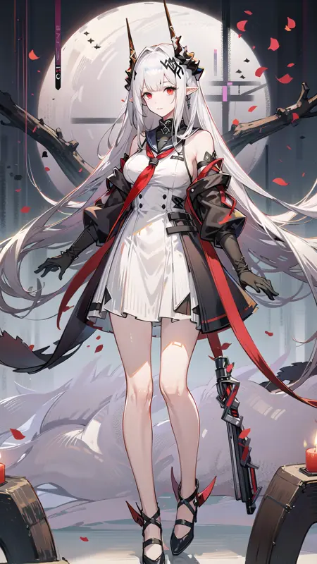 -->プロンプト:mudrockdefclass, 1girl, woman, mudrock (arknights), red eyes, solo, long hair, hair ornament, pointy ears, breasts, white hair, oripathy lesion (arknights), infection monitor (arknights), bangs, breast, black horns, horns,