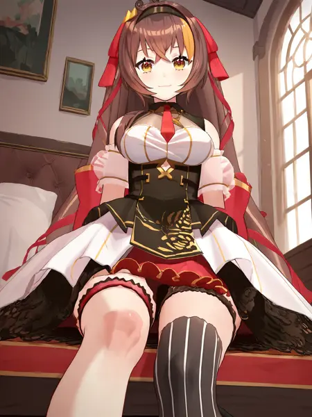 lora:BingTang_Illustrious:1, bingtang, virtual youtuber, 노란 눈, 갈색 머리, 넥타이, 긴 머리, 스타이크드 헤어, 헤어밴드, ahoge, 앞머리, 리본, 드레스, 장갑, 허벅지 스트랩, 단일 히그, 줄무늬 히그, 검은 신발,