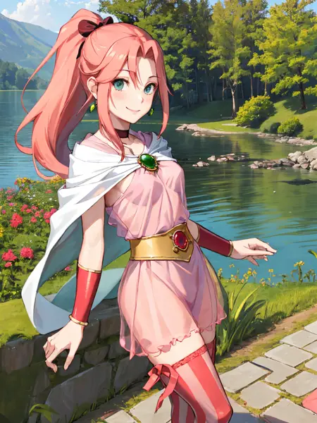 poromffivtay,绿色眼睛,粉色头发,长发,高马尾,马尾,红色发带,耳环,珠宝,项圈