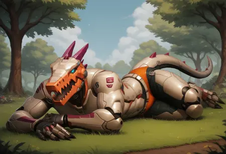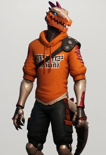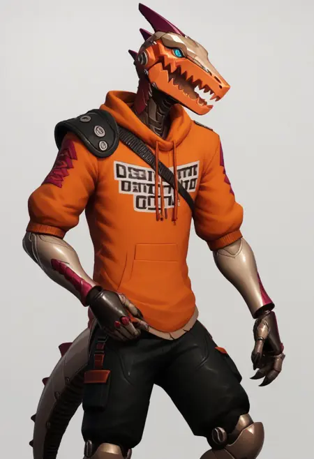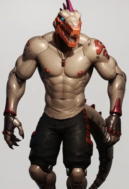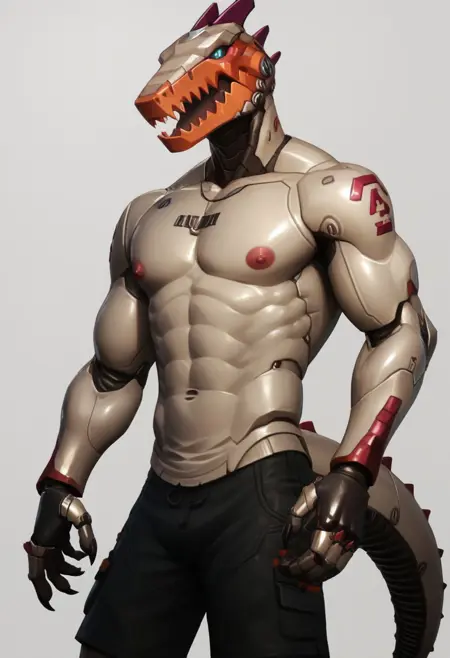 body: robot, dinosaur, mechanical legs, mechanical arms, humanoid robot, tail, blue eyes, claws, mechanical tail,horns, teeth, grey body