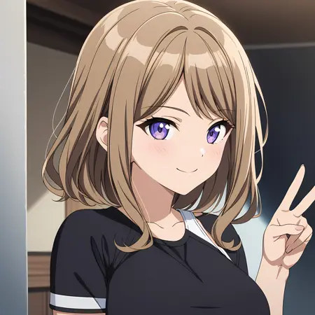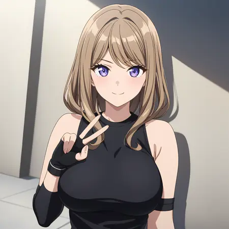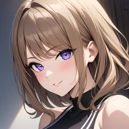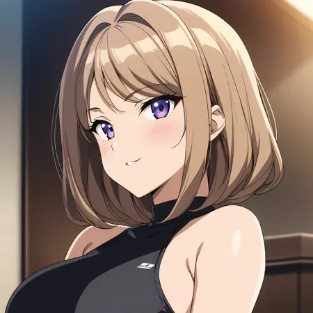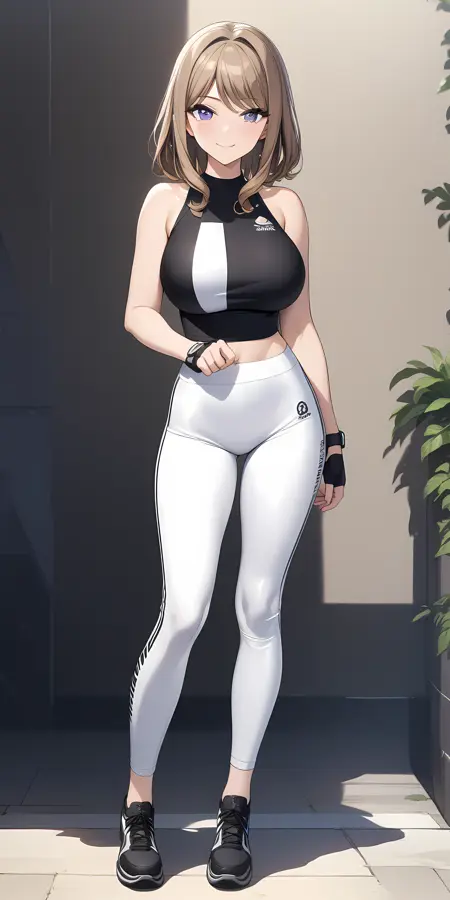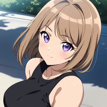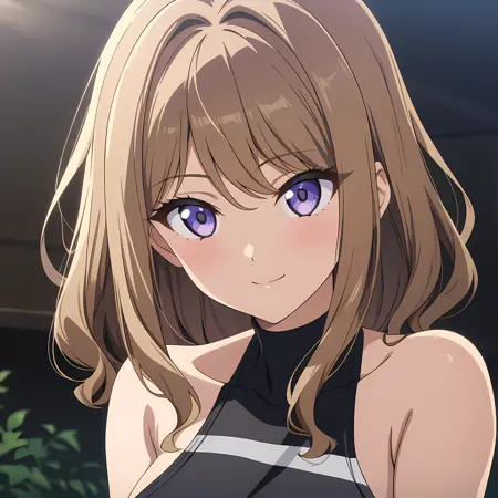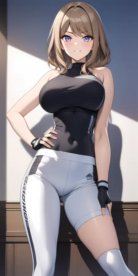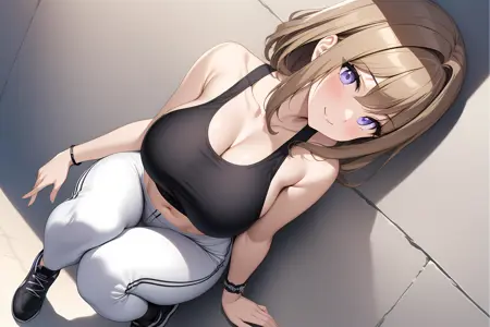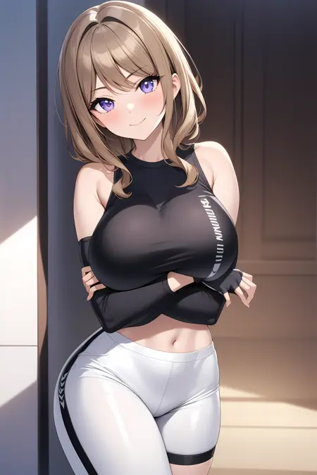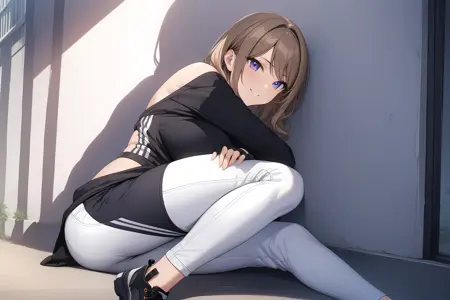 激活标签为 "suminoe_shion, 浅棕色头发, 紫色眼睛, 大胸部, 刘海, 黑色上衣, 黑色运动服, 裸露肩膀, 膝盖护具, 无指手套, 白色裤子, 黑色鞋子",并附加风格标签 "动漫着色" 和 "大友克洋艺术风格"。