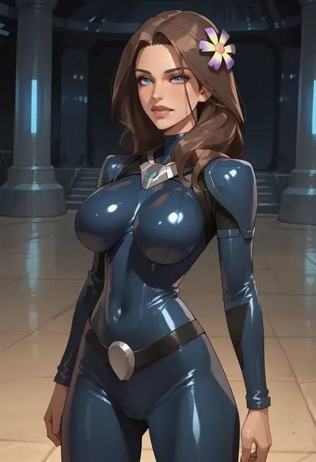 recommended tags: flower in hair, blue eyes, breasts, hair ornament, long hair, brown hair, flower, lips, large breasts, dark skin, bodysuit,
