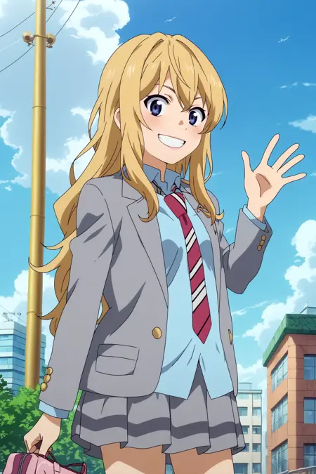 Triggers : kaori miyazono,1girl,solo,long hair,school uniform,necktie,skirt,jacket,blazer,striped necktie,smile,sakuragaoka high school uniform