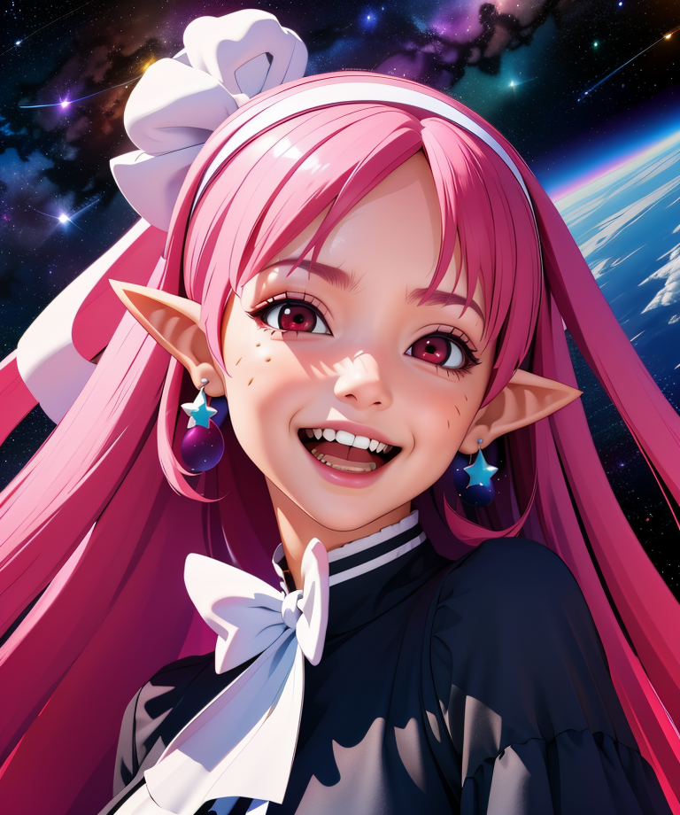 마녀, 긴 분홍색 머리, 뾰족한 귀, 붉은 눈