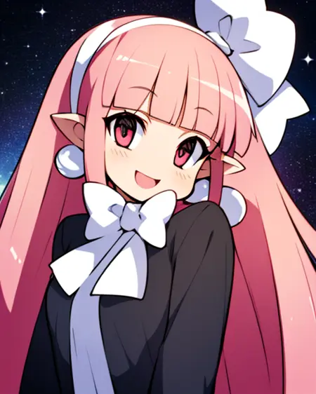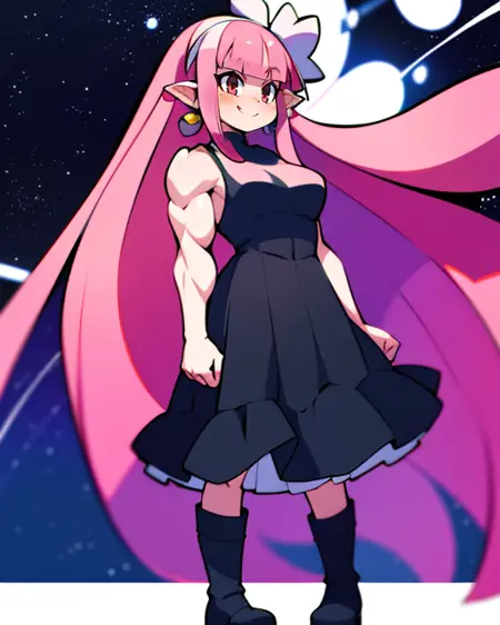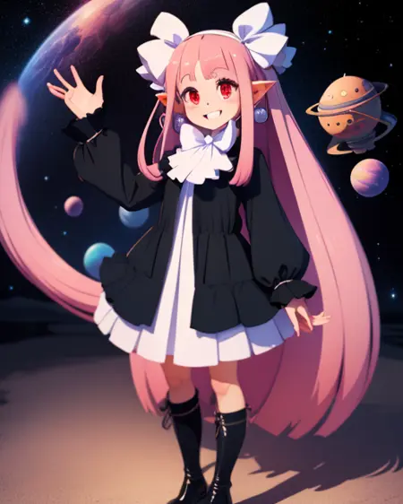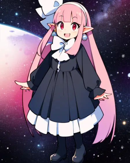 black dress, white hair ribbon, white hairband, long sleeves, earrings, or small white earrings, or pearl earrings, - black boots,