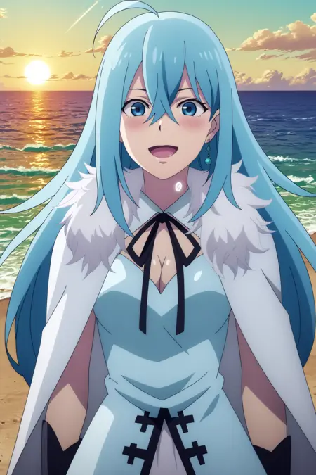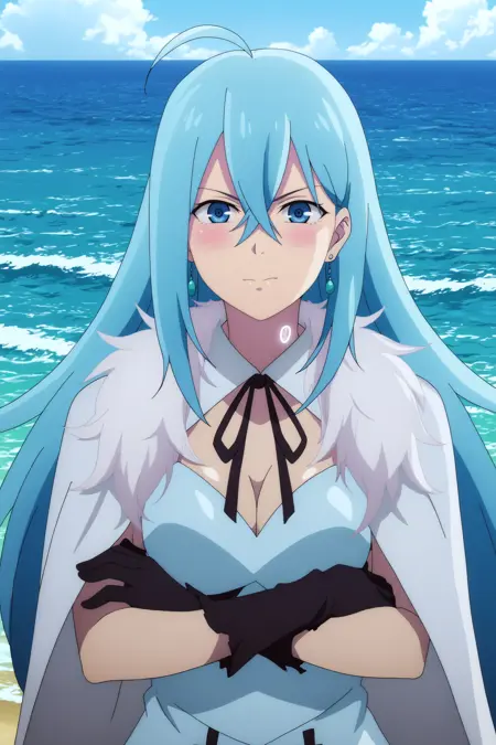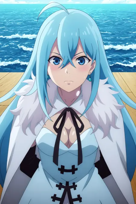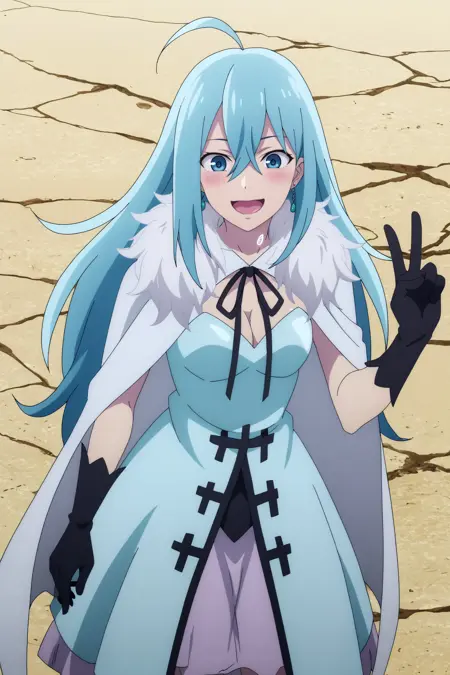 トリガー:diva,1girl,solo,long hair,mature,hair between eyes,earrings,looking_at_viewer,dress,fur trim,white cape,cape,gloves,ribbon,breasts,medium breasts,cleavage,white dress