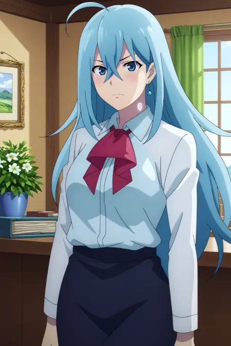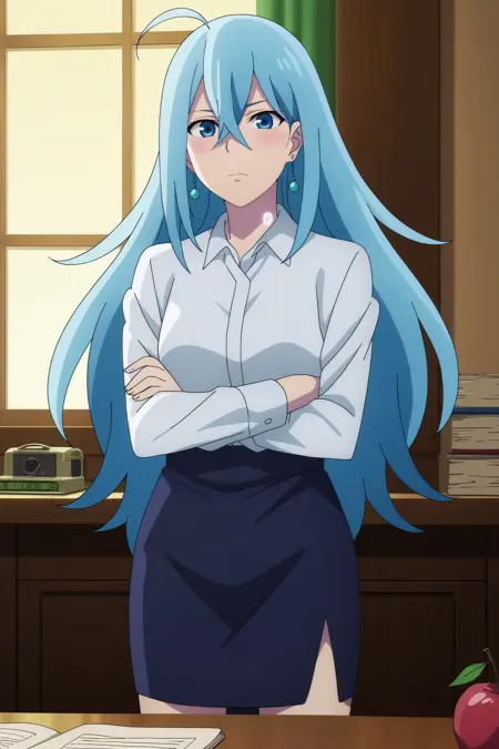 オフィスレディ:diva,1girl,solo,long hair,mature,hair between eyes,earrings,looking_at_viewer,medium breasts,collared shirt,pencil skirt,black skirt