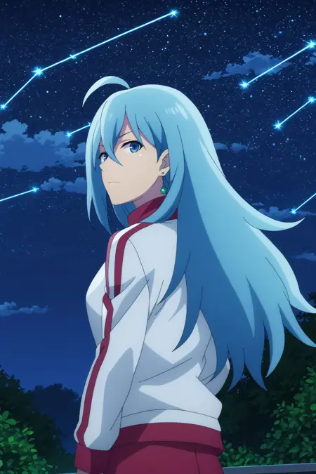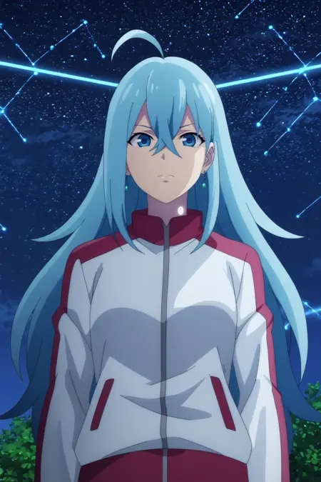トラックスーツ:diva,1girl,solo,long hair,mature,hair between eyes,ahoge,earrings,looking_at_viewer,medium breasts,white shirt,jacket, long sleeves,white jacket,track jacket