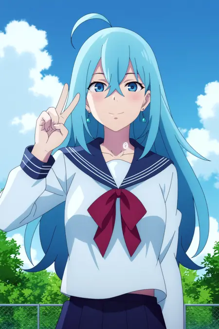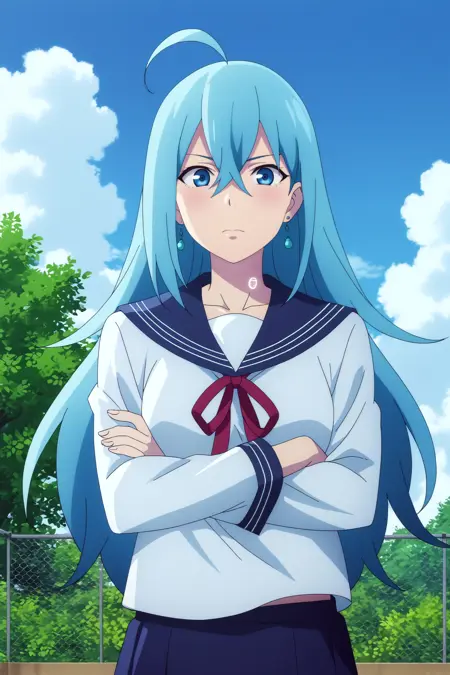 セーラー服:diva,1girl,solo,long hair,mature,hair between eyes,ahoge,earrings,looking_at_viewer,medium breasts,serafuku,ribbon,black skirt