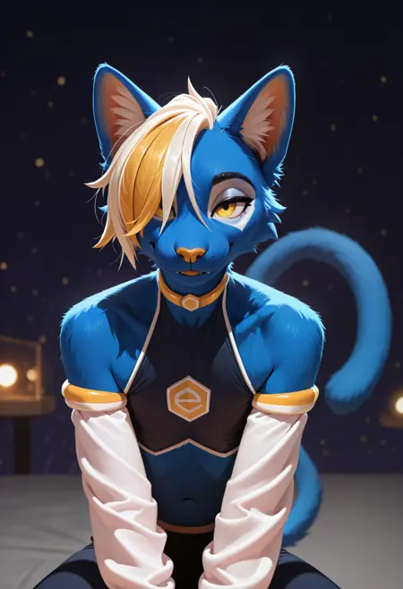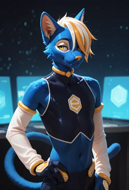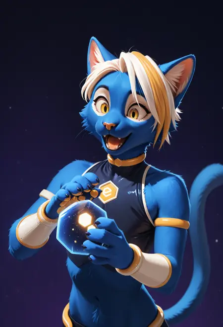 // Pony: hexerade, furry, solo, male focus, multicolored hair, yellow eyes, animal ears, short hair, white hair, cat ears, blonde hair, animal nose, body fur