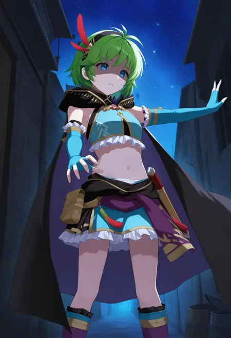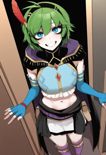 nin0fng、青い目、緑の髪、短髪、アンテナ髪、黒いヘアバンド、羽飾りの髪飾り、黒いマント、青いカーディガン、腹部、へそ、肘までの手袋、青い手袋、指なし手袋、腰周りの衣装、fngスカート、紫の膝丈ブーツ