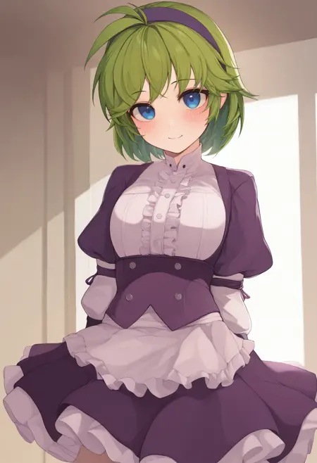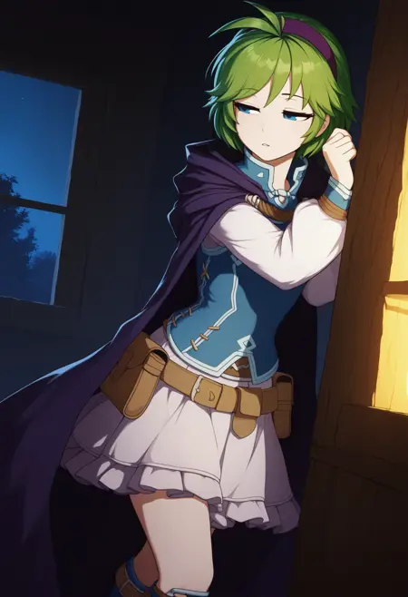 nin0pf、青い目、緑の髪、短髪、アンテナ髪、紫のヘアバンド、青いシャツ、白い袖、長袖、紫の胸当て、紫の肩装甲、紫のカーテン、白いスカート、茶色のベルト、ベルトポーチ、青い手袋、指なし手袋、青い太ももブーツ