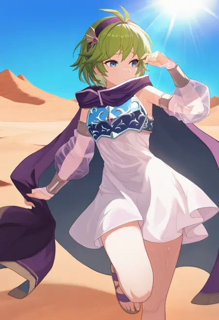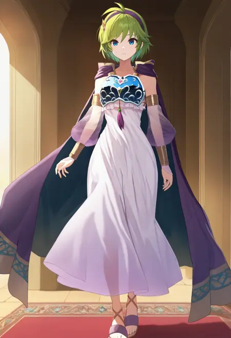 nin0s、青い目、緑の髪、短髪、アンテナ髪、紫のヘアバンド、髪飾り、紫のマント、白いドレス、青い胸当て、分離された袖、透けた袖、バムブラス、サンダル