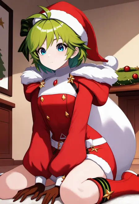 nin0f、青い目、緑の髪、短髪、アンテナ髪、緑の髪リボン、サンタ帽、赤いドレス、ファー縁取り、長袖、サンタ衣装、白いベルト、茶色の手袋、赤い膝丈ブーツ