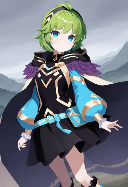 nin0resp、青い目、緑の髪、短髪、アンテナ髪、黒いヘアバンド、羽飾りのマント、黒いドレス、青い袖、ふくらはぎの長袖、青いベルト、ベルトポーチ、黒い膝丈ブーツ