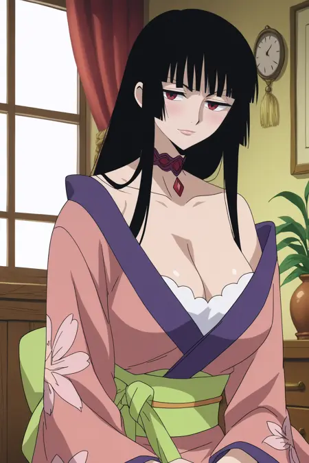Triggers : yuko ichihara,1girl,solo,long hair,mature,japanese clothe,kimono,very_long_hair,hime_cut, bangs,blunt bangs,breasts,cleavage, large_breasts, choker