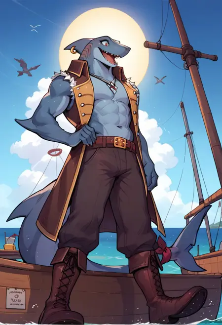 fin piercing, tailband, open vest, pants, belt, shark tooth necklace