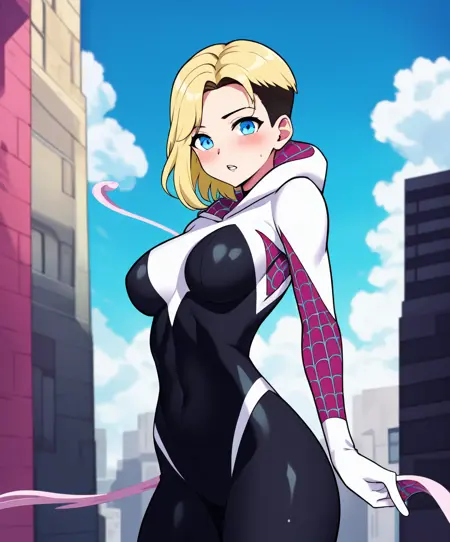 おすすめのポジティブプロンプト(マスクなし): gwen_stacy, 1girl, solo, hood, bodysuit, 黒いボディスーツ, フード付きボディスーツ, フードを下ろした状態, ((スパイダーウェブプリント)), ((ピンクのスパイダーウェブプリント)), 金色の髪, スキントight, スーパーヒーロー, マスクなし, 中程度の胸, ハーフトーン, ((非対称な髪型)), 青い目, ((アンダーカット)), ((白いボディスーツ)), (バレエシューズ)