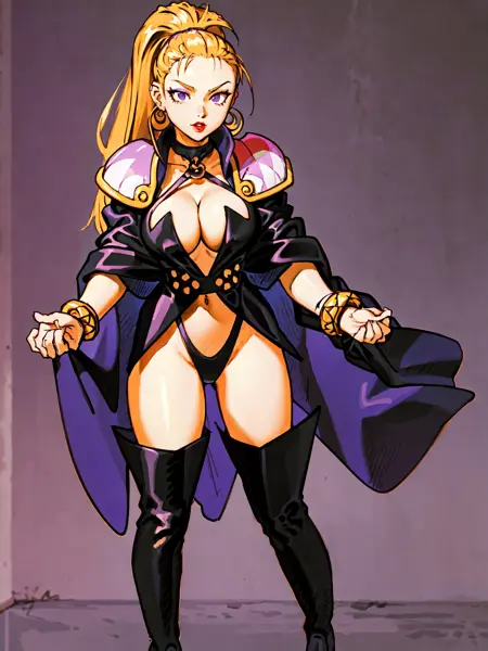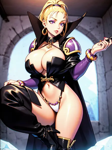 "노란 머리, 높은 페니테일, 긴 머리, 보라색 눈, 아이섀도우, 립스틱, 메이크업, 보름달 모양 귀걸이, 머리 장식, 보석, 큰 가슴, 흰색 비키니 아래만, 드러난 옷차림, 긴 소매, 흐르는 천, 전통적인 마녀 스타일, 어깨 갑옷, 망토, 망토 칼라, 팔찌, 배꼽, 하이레그, 하이힐 부츠,"