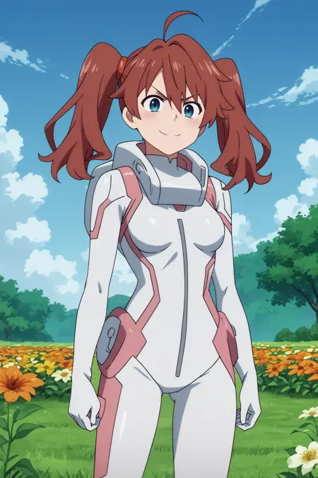 바디수트: kokoro,1girl,solo,long hair,twintails,ahoge,bodysuit,white bodysuit,pilot suit,long hair