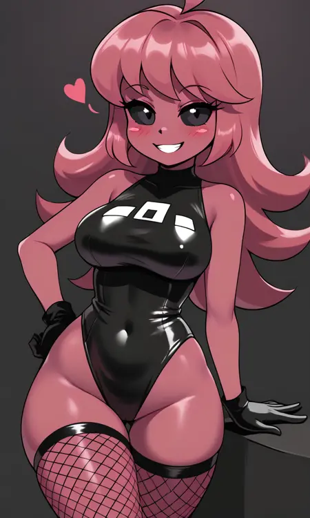 Minus GF, dark pink skin, pink hair, black eyes, black sclera, fishnets, black leotard, smile, fishnet thigh highs, black gloves, large breasts, blush