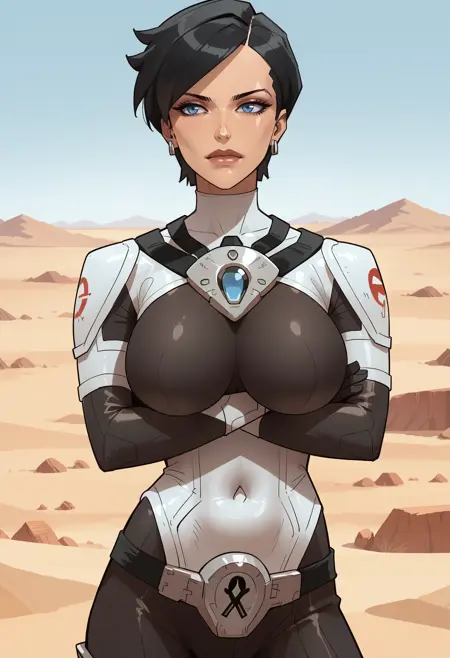 recommended tags: breasts, dark skin, solo, blue eyes, dark-skinned female, hands on hips, short hair, earrings, jewelry, large breasts, lips, bodysuit, black hair,