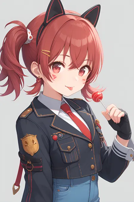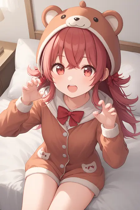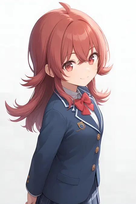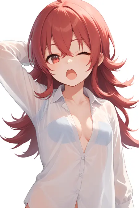 - 1girl, solo, 红眼, 红发, 天线发, 长发, 刘海, 握紧的双手