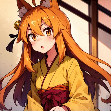 Generation Parameters (V3): suzu, fox ears, fox tail, brown eyes, orange hair, yellow miko kimono, bell hair ornament, medium hair, ahoge, hair between eyes
