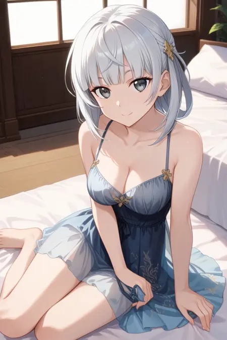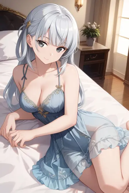 - 1girl, solo, hair ornament, blue eyes, grey hair, bangs, blunt bangs, feather hair ornament
