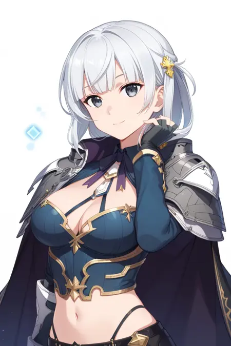 - clothing cutout, cleavage cutout, navel, cleavage, gloves, midriff, armor, black gloves, medium breasts, skirt, shoulder armor