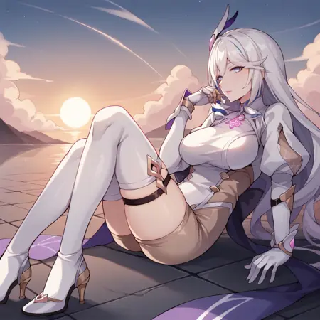 HareSpecialHi3, Hre_Bss, 长发, 蓝眼睛, 侧边钻头发型, 蓝色发缕, 条纹发色, 白发, 白色袖子, 宽袖, 护甲手套, 蓬松长袖, 白色手套, 粉红宝石, 肩饰带, 紫色披肩, 王冠, 发饰, 白色紧身裤, 紧身裤, 短裤下穿紧身裤, 浅棕色短裤, 超短裤, 多层腿部穿搭, 白色连体衣, 连体衣, 露脐, 胸部宝石, 腰部斗篷, 头饰, 荷叶边小斗篷, 双面小斗篷, 白色小斗篷, 白色鞋履, 短靴, 高跟靴,