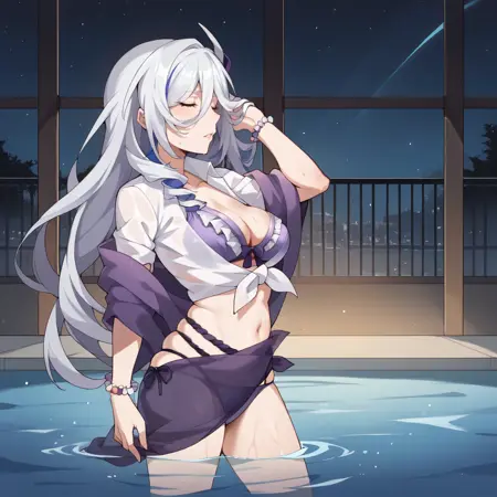 DW_Sum, 交叉式吊带, 吊颈式泳装, 短裤泳装, 白色短裤, 紫色腰带, 内裤带, 黑色大腿绑带, 手腕缠绕式发圈, 短款上衣, 白色上衣, 露肩上衣, 手环,
