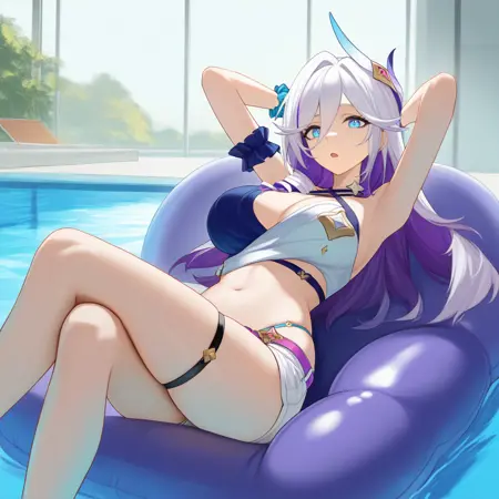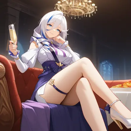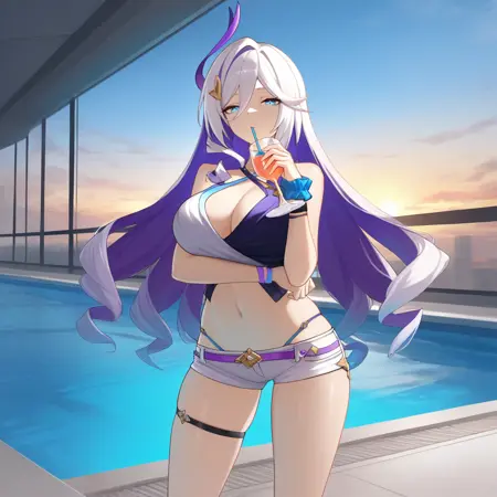 HareSpecialHi3, Hre_Bss, 긴 머리, 파란 눈, 사이드 드릴, 파란 스트라이프, 스트라이프 머리, 흰 머리, 흰 소매, 넓은 소매, 갑옷 장갑, 부푼 긴 소매, 흰 장갑, 분홍 보석, 애기릴렛, 보라색 스톨, 왕관, 머리 장식, 흰 레깅스, 레깅스, 반바지 아래 레깅스, 밝은 갈색 반바지, 짧은 반바지, 계층적 하의, 흰 바디슈트, 바디슈트, 배꼽 가린, 가슴 보석, 허리 망토, 머리 장식, 프릴 망토, 양면 망토, 흰 망토, 흰 신발, 발목 부츠, 하이힐 부츠,