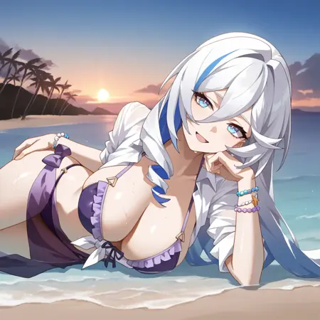 DW_Swm, 대체 수영복, 보라색 비키니, 프릴 비키니, 보라색 사롱, 투명 사롱, 대체 흰 셔츠, 열린 셔츠, 매듭 셔츠, 투명 셔츠, 복부 노출, 앞매듭 탑, 구슬 팔찌, 보라색 샬, 샬,