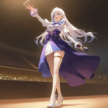 DW_Idol, 드레스, 흰 드레스, 이색 스커트, 보라색 스커트, 흰 스커트, 골드 허벅지 스트랩, 측면 슬릿, 어깨 스트랩, 줄리엣 소매, 흰 소매, 프릴 소매, 보석, 허리 높은 스커트, 긴 스커트, 프릴 칼라, 보라색 리본, 목 리본, 보라색 리본, 사이드 파니테일,