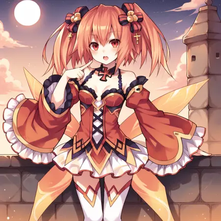 교차 끈 옷, 빨간 드레스, 프릴 스커트, 흰 스커트, 어깨 끈, 손목을 넘는 소매, 분리형 칼라, 검은 칼라, 보석, 흰 허벅지 스타킹, 앵클 부츠, 빨간 부츠, 분리형 소매, 프릴 소매, 어깨 노출, 긴 소매, 넓은 소매, 빨간 소매, 머리 장식,