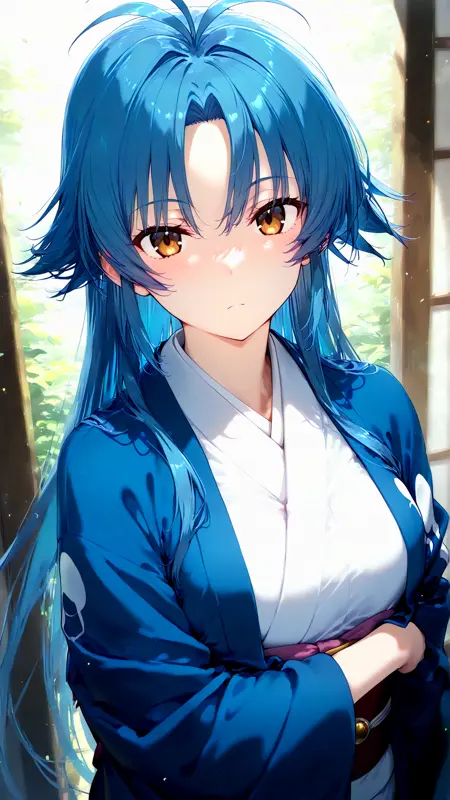 外观:棕色眼睛,蓝色头发,长发,马尾,