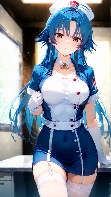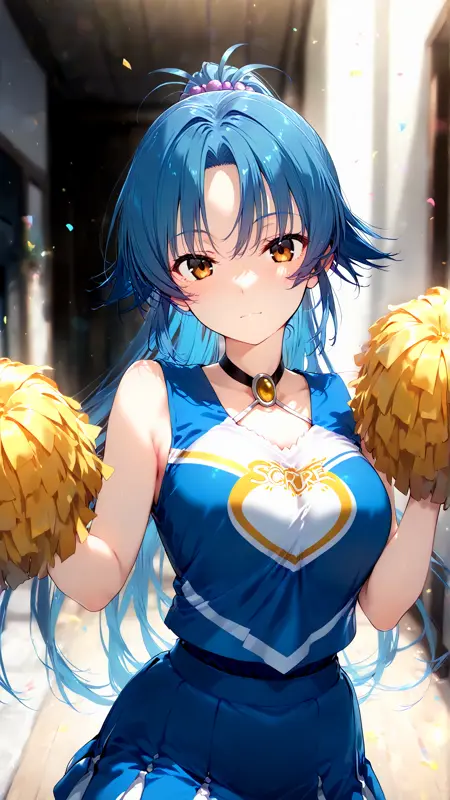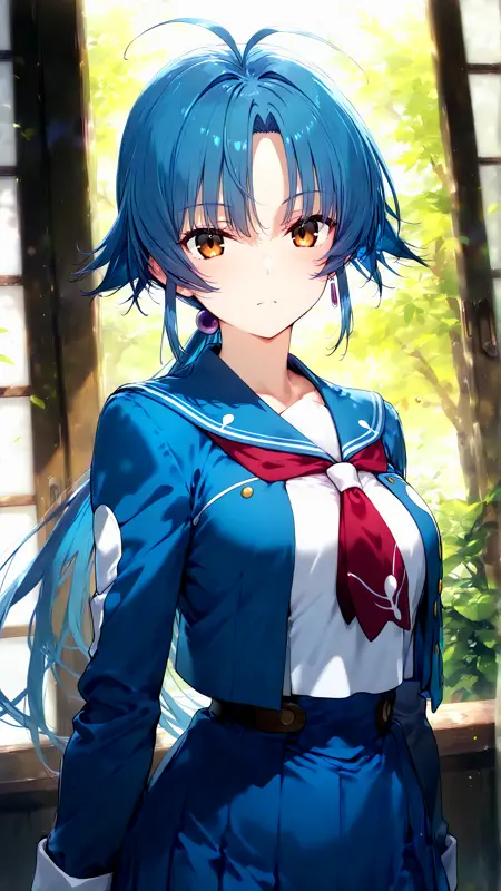 外观:棕色眼睛,蓝色头发,中等胸部,长发,低马尾,