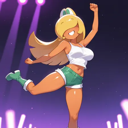 白いタンクトップ、肩出し、腹部露出、緑のショートパンツ、ビーチショーツ、緑のブーツ