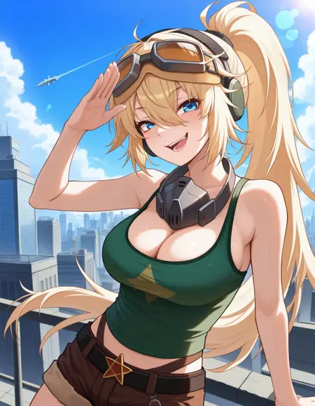 lilyadef, ブロンドヘア, 長髪, 青い目, レイヤー帽, ゴーグルを頭に装着, ボンバー・ジャケット, グリーンのタンクトップ, 腹部露出, 短パン, ハイレグパンティ, ベルト, 太ももストラップ, 茶色の手袋, 呼吸器, 膝上ブーツ