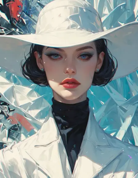 retroglamxr, 1girl, solo, 耳飾り, ジュエリー, 帽子, 白い頭部装具, 手袋, 白い手袋, 青い背景, 白い髪, 唇, リップスティック, 短髪, リアリスティック, ヘルメット, 開いた唇, ポートレート, 科学フィクション, 赤い唇, ボディスーツ, 目を閉じた, 黒い髪, 簡単な背景