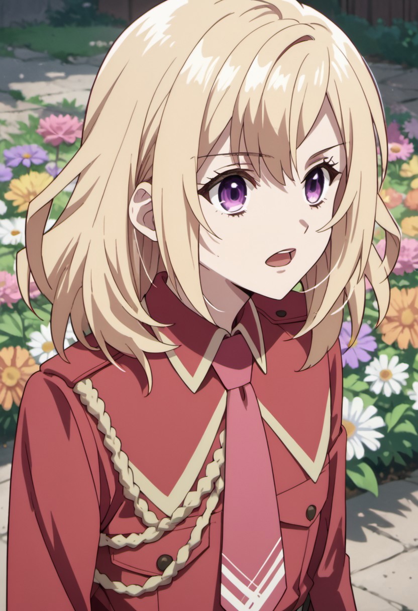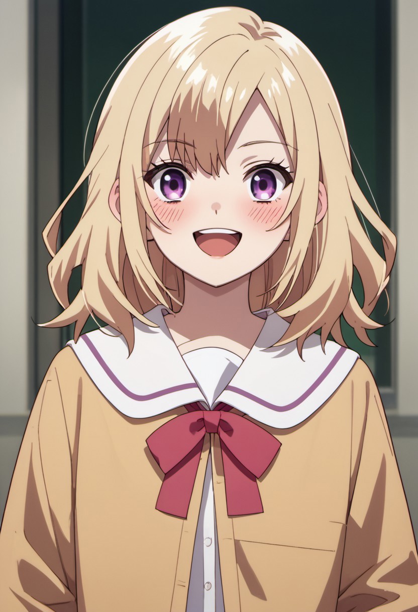 トリガー単語: savelle jill、ミディアムヘア、ブロンドヘア、パープルアイ