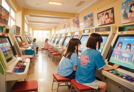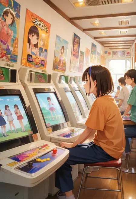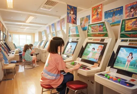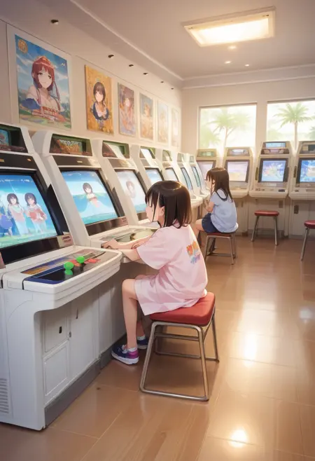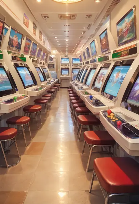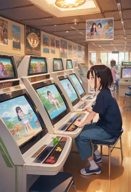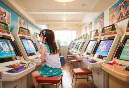 이 LoRA는 약간 오래된 일본의 아케이드 게임센터에 중형 캐비닛이 놓인 풍경을 묘사할 수 있을 것입니다.