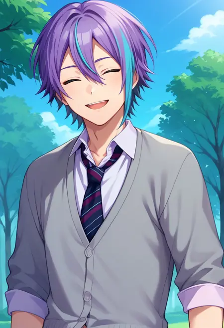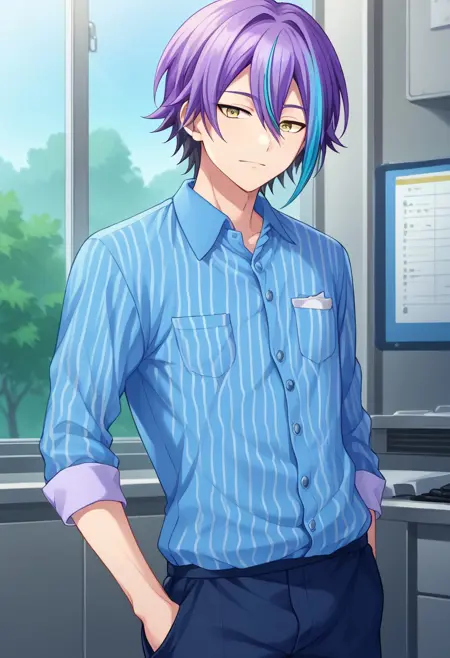 1boy, male focus, solo, yellow eyes, multicolored hair, streaked hair, hair between eyes, purple hair, blue hair, shirt, white shirt, collared shirt, necktie, striped necktie, diagonal striped, diagonal-striped necktie, cardigan, grey cardigan, sleeves rolled up, pants,
