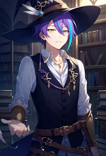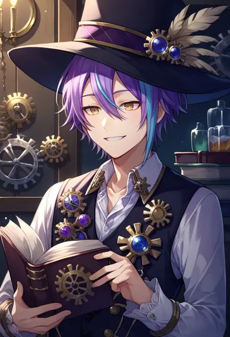 1boy, male focus, solo, yellow eyes, multicolored hair, streaked hair, hair between eyes, purple hair, blue hair, hat, black headwear, shirt, white shirt, collared shirt, vest, black vest, frills, frilled sleeves, long sleeves, pants, black pants, jewelry, brooch, gears, steampunk,