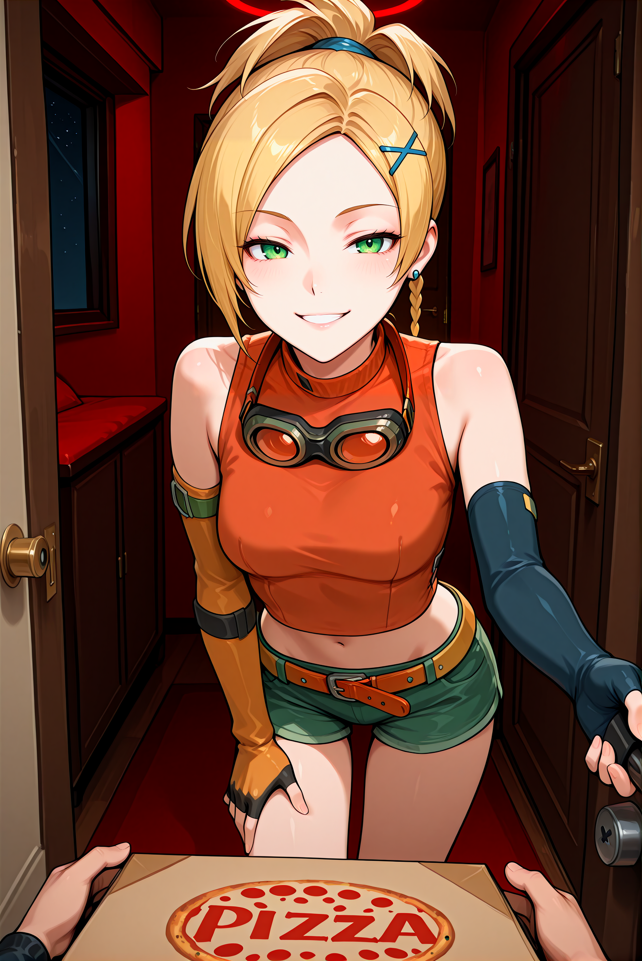 -Outfit prompt: orange sweater, bare shoulders, bare belly, navel, gloves, green shorts, belt, goggles around neck, pouch,