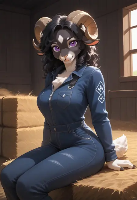 (퍼리, 앤트로, 앤트로-양소녀), 질감 있는 털, 앤트로 여성, 양 뿔, 검은색 머리카락, 곱슬머리, (검은 털), 흰색 배 털, 털 무늬, 푹신한, 보라색 눈, 이마에 하얀 다이아몬드 무늬, 큰 가슴,