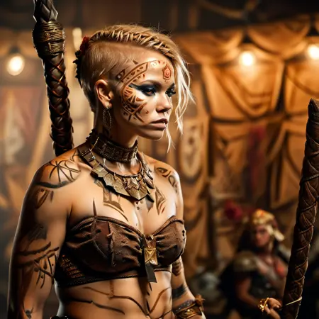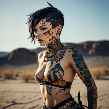 1boy, 1girl, abs, arm tattoo, armor, arms at sides, artist name, back tattoo, barbarian, bare shoulders, beads, beard, belt, black background, black hair, black lips, black nails, blonde hair, blue eyes, blue sky, blurry background, bodypaint, bra, bracelet, braid, breasts, brown eyes, brown hair, choker, cleavage, closed eyes, closed mouth, covered nipples, crop top, dark skin, dark-skinned male, denim, depth of field, desert, dreadlocks, ear piercing, earrings, facepaint, facial hair, facial mark, facial tattoo, fingerless gloves, flat chest, from side, full-body tattoo, fur trim, gloves, green eyes, grey eyes, hair over one eye, headband, holding, holding sword, holding weapon, injury, jewelry, katana, knife, large breasts, lips, long hair, long skirt, looking at viewer, makeup, male focus, manly, mask, medium breasts, midriff, mole, mouth hold, muscular, muscular male, mustache, navel, neck tattoo, necklace, nipples, nose, nose piercing, old, old man, open clothes, open mouth, outdoors, pants, parted lips, pauldrons, piercing, polearm, ponytail, portrait, profile, realistic, red hair, ring, sand, scar, short hair, shoulder armor, shoulder tattoo, signature, simple background, skirt, small breasts, solo, spear, standing, strapless, strapless bra, suspenders, sword, tank top, tattoo, teeth, topless, topless male, tribal, tube top, twin braids, underwear, upper body, weapon, wet, white hair