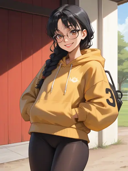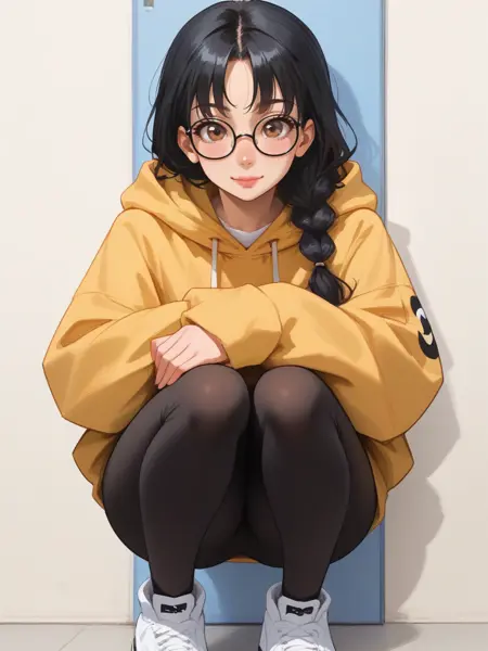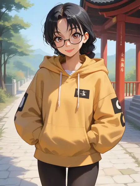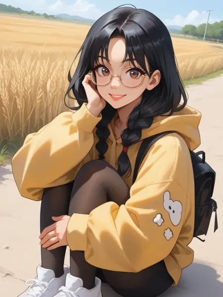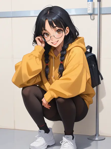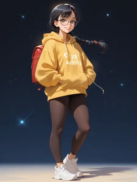 Luna Lu Santos, Lu Santos, 椭圆形脸,深棕色眼睛,戴眼镜,长直黑发,松散的辫子,皮肤带有橄榄色底调,fair olive undertone skin,穿着黄色 oversized 连帽衫,黑色紧身裤,穿着运动鞋,红色背包